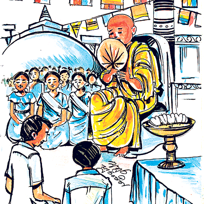 දෙව්රම් වෙහෙර වැඩසිටින බුදු හාමුදුරැවෝ දවසක් පිඬුසිඟා වඩින විට ළමයි පිරිසක් ගල්මුල් අරගෙන නොසන්සුන්ව සිටියා. උන්වහන්සේ ඒ දැක ඒ ළමයින්ගෙන් ළමයි ඔය මොකෙක්ද කියා ඇසුවා. නයෙක් කියා ඔවුන් පිළිතුරැ දුන්නා. ඔය නයාට කරදර කරන්නෙ ඇයි කියල බුදු හාමුදුරැවො ඔවුන්ගෙන් ඇහුවා. ඌ කෑවොත් අපව මැරෙනවා කියල ඒ ළමයි කිව්වා. ළමයිනේ ඔයාලා ගෙදර යන්න. නයා ඔයාලට කරදරයක් කරන්නෙ නෑ. ඌ කැලේට යයි. ඔයාලට කවුරැහරි දණ්ඩකින් ගැහැව්වොත් ඔයාලට රිදෙනවා. ඒ හින්ද අපේ සැප පිණිස සතුට පිණිස සතෙකුටවත් හිංසාවක් කරන්න හොඳ නෑ. මෙහෙම කියල බුදු හාමුදුරැවො ළමයින්ට අවවාද කළා. ඒ ළමයි බුදු හාමුදුරැවන්ගෙ අවවාදය අහල ගොඩක් සතුටු වුණා. ඒ විතරක් නෙමේ එයාල ඔක්කොම සෝවාන් වුණා.