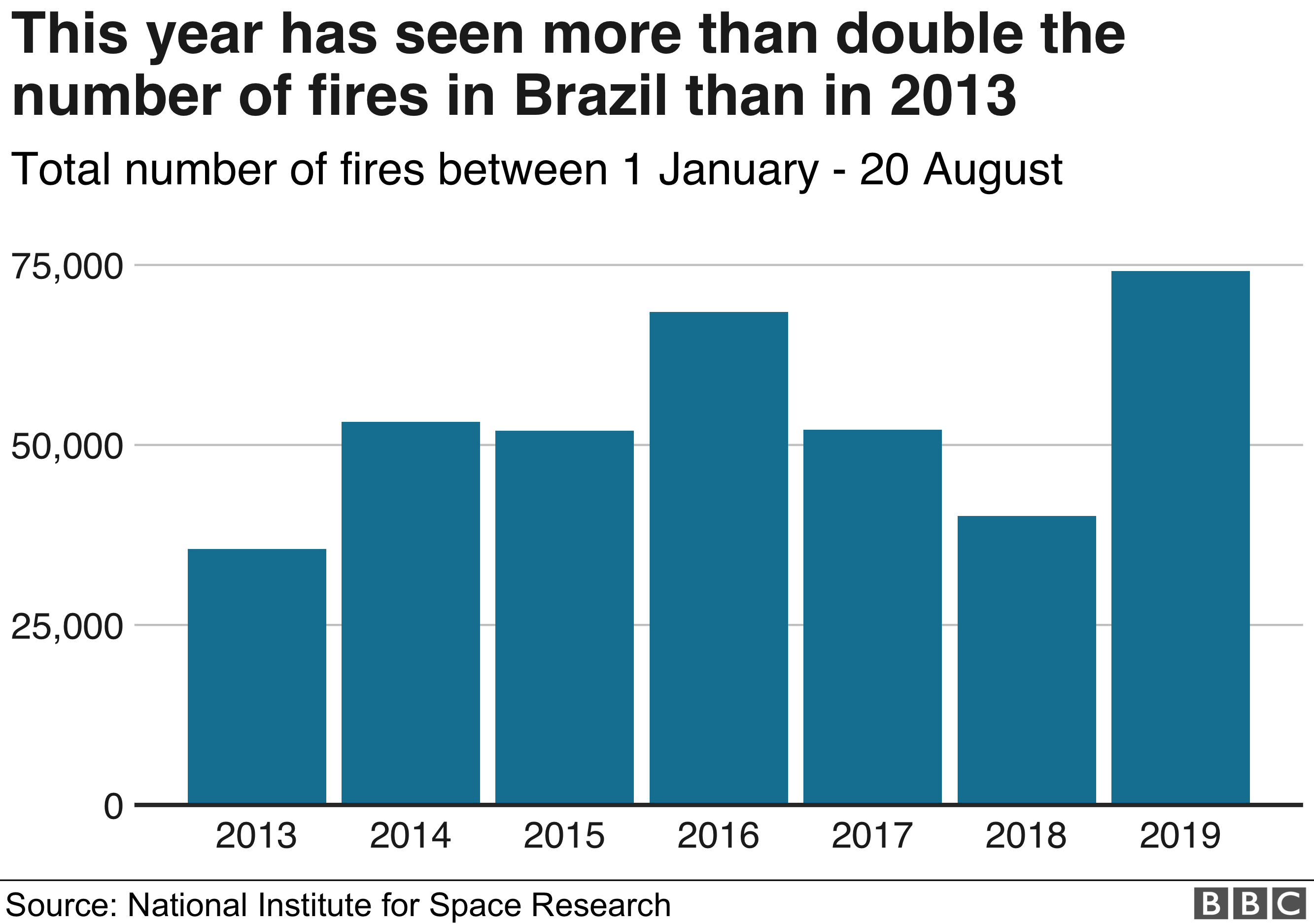 2013 සිට මේ දක්වා වූ ගිනිගැනීම් වලින් ඉහළම අගය වාර්තාවන්නේ, ජනවාරි මාසයේ සිට අගෝස්තු දක්වා කාලය තුළ වූ ගිනිගැනීම් 74,000ක් සම්බන්ධයෙන් බවත්, ඇමසන් වන ප්රදේශය ආශ්රිතව වනාන්තරවල ගිනිතැබීම් 9,500ක් පසුගිය බ්රහස්පතින්දා සිට වාර්තා වී ඇති බවත් ගණන් බලා ඇත. 2018 වසරේදී මෙම කාලයේදී ම ගිනිතැබීම් 40,000ක් පමණ වාර්තා වී තිබිණි. 2016දී එය 68,000ක් පමණ විය.