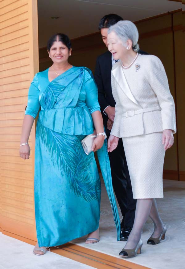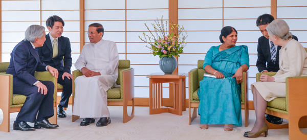 ටෝකියෝ නුවර පිහිටි ඉම්පීරියල් මන්දිරය වෙත ගිය ජනාධිපති මෛත්රීපාල සිරිසේන මහතා සහ ජයන්ති සිරිසේන මහත්මිය අකිහිතෝ අධිරාජ්යයා සහ මිචිකෝ රැජිණ විසින් ඉතා උණුසුම් හා සුහදශීලී ලෙස පිළිගනු ලැබීය.