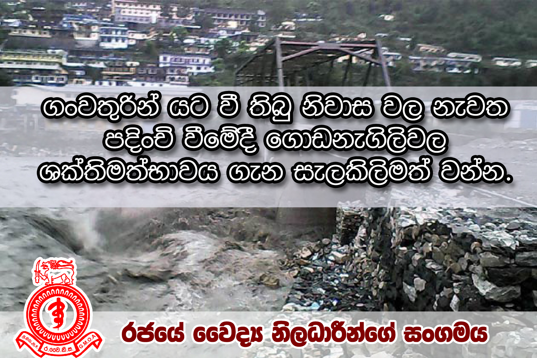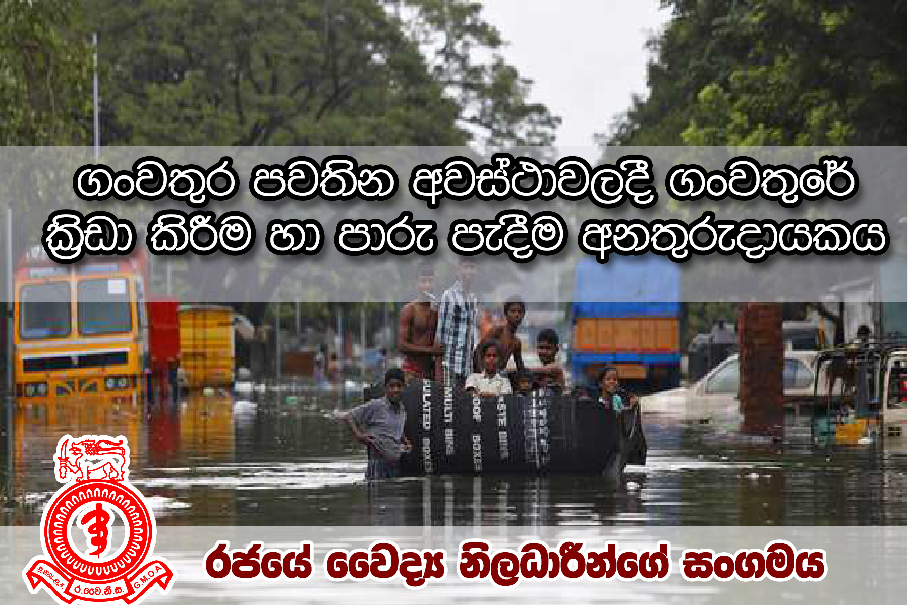 ගංවතුර තත්වය ටිකෙන් ටික අඩු වුනත් තවමත් ජන ජීවිතයට සමාන්ය තත්වය පත්වී නැත. බොහෝ දෙනා මේ වන විට තමන්ගෙ ගෙවල් දොරවල් පිරිසිදු කරනව. මේ අයට උපකාර කරන්නත් බොහෝ පිරිස් එකතු වී සිටී. ගං වතුර කියන්නෙ මුළුමනින්ම විෂබීජවලින් ගහන නිසා හිස ඔසවන ලෙඩ රෝග වැඩි විය හැකිය. ඒ නිසා සෞඛ්ය නියාමකයින්ගේ වගකීමක් ලෙස රජයේ වෛද්ය නිලධාරීන්ගේ සංගමය ගංවතුර ආපදා තත්ත්වයේදී මහජනතාව වෙත සෞඛ්ය පණිවුඩයක් මගින් ජනතාවට උපදෙස් මාලාවක් නිකුත් කර තිබෙනවා.