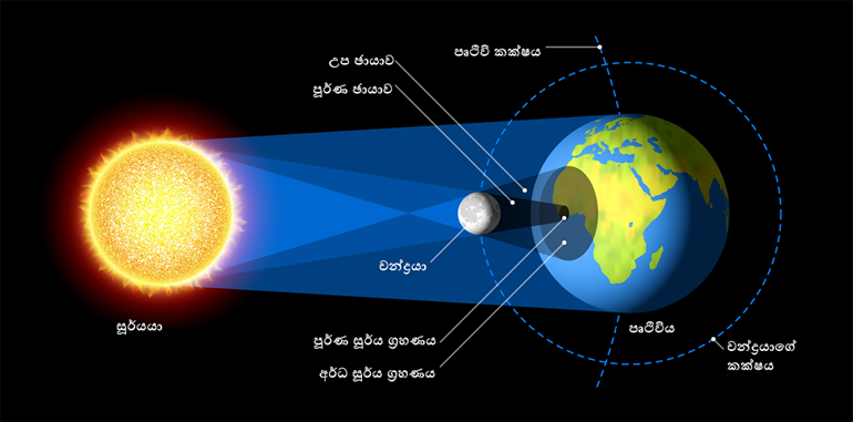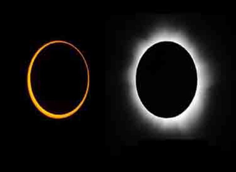 පෘථිවියේ සිට හඳ පිහිටන දුර මෙන් හාරසිය ගුණයක් පමණ දුරින් හිරු පිහිටයි.හිරුගේ විෂ්කම්භය (පළල) හඳෙහි විෂ්කම්භය (පළල) මෙන් හාරසිය ගුණයක් පමණ විශාල වේ. එබැවින් පෘථිවියේ සිටින අපට පෙනෙන්නේ හිරු හා හඳ ප්රමාණයෙන් එක සමාන ලෙසය. එවිට හඳෙහි මුහුණතෙන් හිරුගේ මුහුණත සම්පූර්ණයෙන්ම මුවා වන්නාක් මෙන් අපට පෙනේ.මේ අයුරින් හිරු එළිය පෘථිවියට නොලැබී යාම නිසා විනාඩි කිහිපයකට සීමාවන රාත්රියක් අපට උදා වේ.