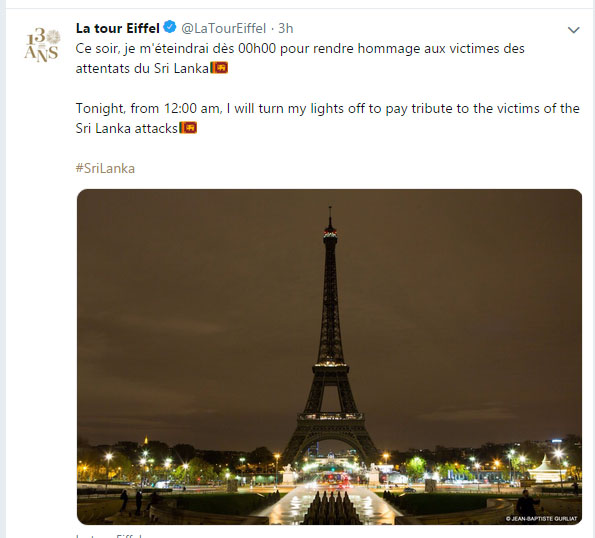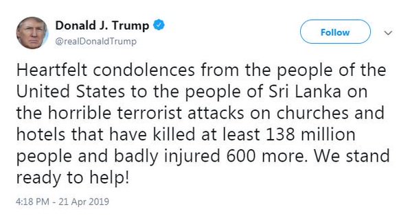 "වටිනා ජීවිත සහ සිය ගණනක් තුවාල ලද ශ්රී ලංකාව තුළ පාස්කු ඉරිදා එල්ල වූ බියකරු ත්රස්ත ප්රහාරය දැඩිව හෙළා දකිනවා" යනුවෙන් ඔහු නිකුත් කළ ට්විටර් පණිවුඩයේ දැක්වේ.