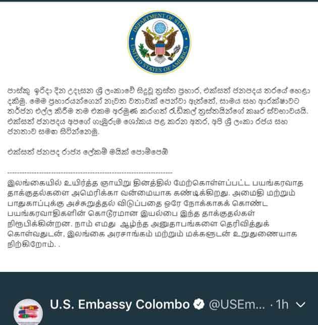 පාස්කු ඉරිදා දින ශ්රී ලංකාවේ සිදු වූ ත්රස්ත ප්රහාර එක්සත් ජනපදය තරයේ හෙළා දකින බවත් එම ප්රහාර සාමය සහ ආරක්ෂාවට තර්ජන එල්ල කිරීම තම එකම අරමුණ කර ගත් රැඩිකල් ත්රස්තයින්ගේ කෘෘර ස්වභාවය පෙන්නුම් කිරීමක් යැයි ඇමෙරිකා එක්සත් ජනපද රාජ්ය ලේකම් මයික් පොම්පෙඕ මහතා නිවේදනයක් නිකුත් කරමින් කියා සිටියි.