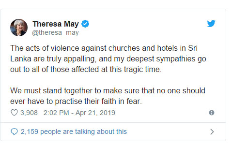 මේ අතර, බ්රිතාන්ය අග්රාමාත්ය තෙරේසා මේ ද ට්විටර් ඔස්සේ නිවේදනයක් නිකුත් කර ඇත.