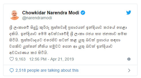 "ශ්රී ලංකාවේ සිදුවූ කුරිරු ත්රස්තවාදී ප්රහාරයන් ඉන්දියාව තරයේ හෙළා දකින," බව ඉන්දීය අග්රාමාත්ය නරේන්ද්ර මෝදි නිවේදනය කර තිබේ.