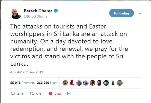 ඇමරිකාවේ හිටපු ජනපති බැරැක් ඔබාමා මහතාද ටුවිටර් පණිවිඩයක් නිකුත් කරමින් ප්රහාරය ගැන කණස්සල්ල පල කර ඇත. පාස්කු මෙහෙයට හා සංචාරකයින්ට එල්ල කළ මිලේඡ ප්රහාරය මනුසවයට එල්ල කළ ප්රහාරයක් බව ඔහු ප්රකාශ කරයි. විපතට පත් වූවන් සමග අපද සිටින බවද ඔහු කියයි.