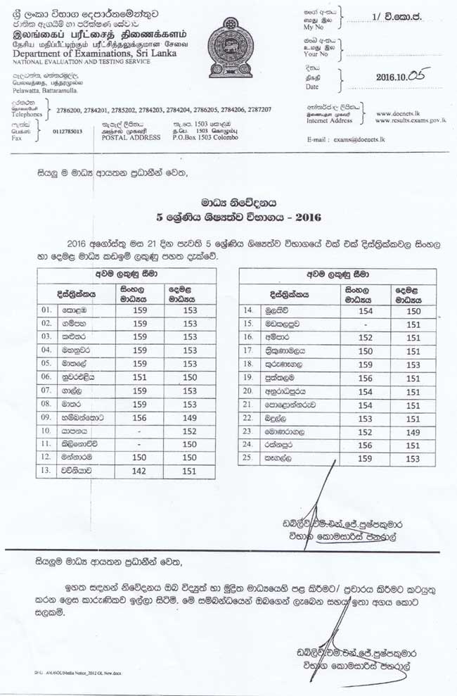 ශිෂ්යත්වයේ දිස්ත්රීක් පදනම මත කඩඉම් ලකුණු ද නිකුත් කර තිබේ.