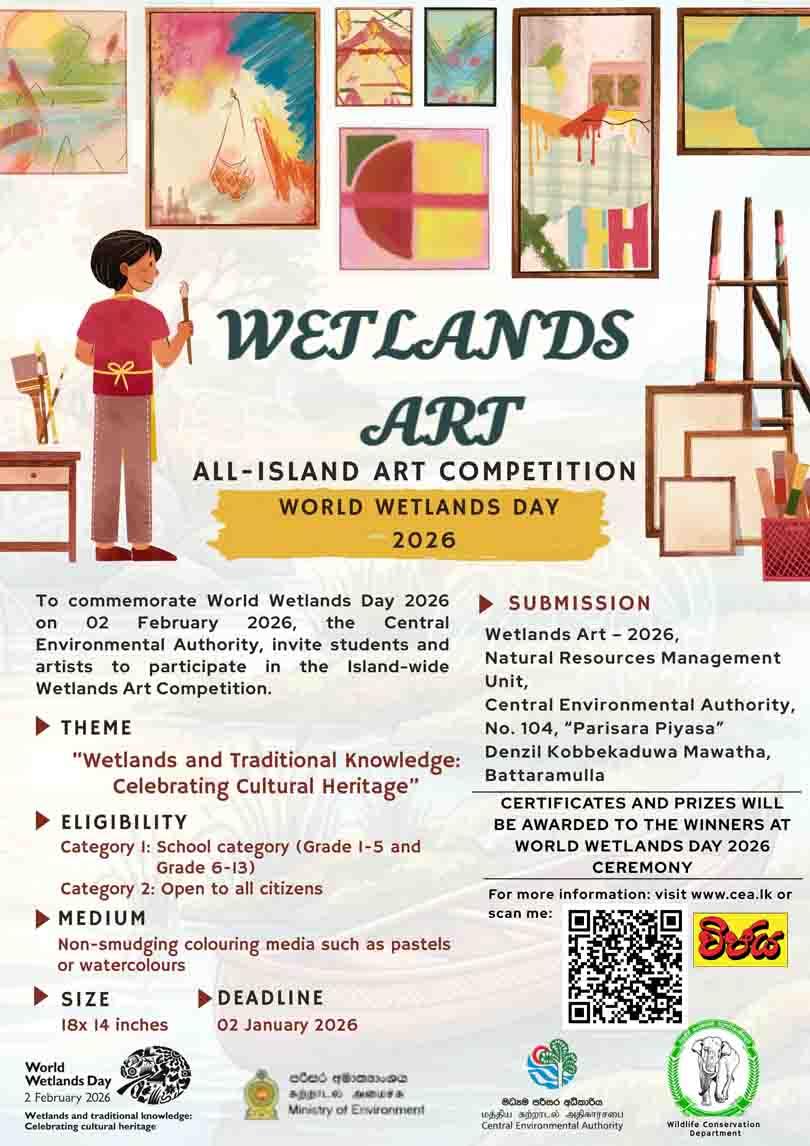 2026 තපබරවාරි 02 වැනි දිනට යෙදෙන ලෝක තෙත් බිම්  දිනය නිමිත්තතන් මධ්‍යම පරිසර අධිකාරිය, වනජිවී සංරක්ෂණ ෙදපාර්තෙම්න්තුව හා අධ්‍යාපන අමාත්‍යාංශය ඒකාබද්ධව විජය පුවත්පත් සමාගමේ මාධ්‍ය අනුග්‍රහතයන් පවත්වනු ලබන දීප ව්‍යාප්ත චිත්‍ර තරඟාවලියට නිර්මාණ බාර ගැනේ.. පාසල් හා විවෘත යන අංශ දෙක සඳහා මෙම තරඟය පැවැත්වීමට කටයුතු සංවිධානය කර ඇත.