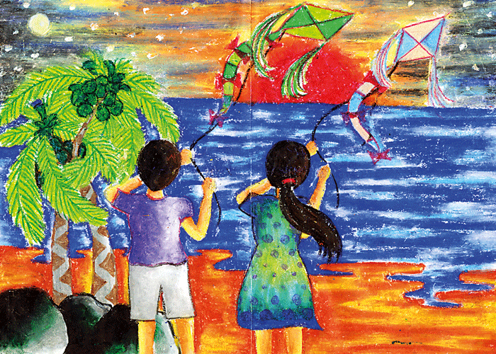 සැඳෑ කාලයේ මුහුදු වෙරළේ සරැංගල් අරින ළමයි