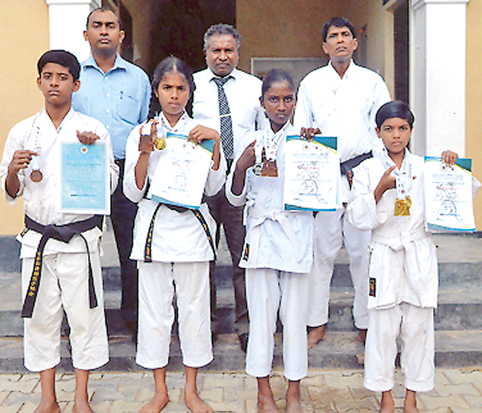 එම පිරිස (වමේ සිට) හංස පසිඳු, ඉත්මා එත්නි ප්රසාදි , සඳුනි ඉරේෂා හා විදුනි අයේෂා, විදුහලේ කරාතේ ක්රීඩාභාර ආචාර්ය ඉන්දික තිලකරත්න, විදුහල්පති සාගර කුමාරසිංහ හා කරාතේ උපදේශක ශිහාන්, එස්. සමරවීර මහත්වරැන් සමග.